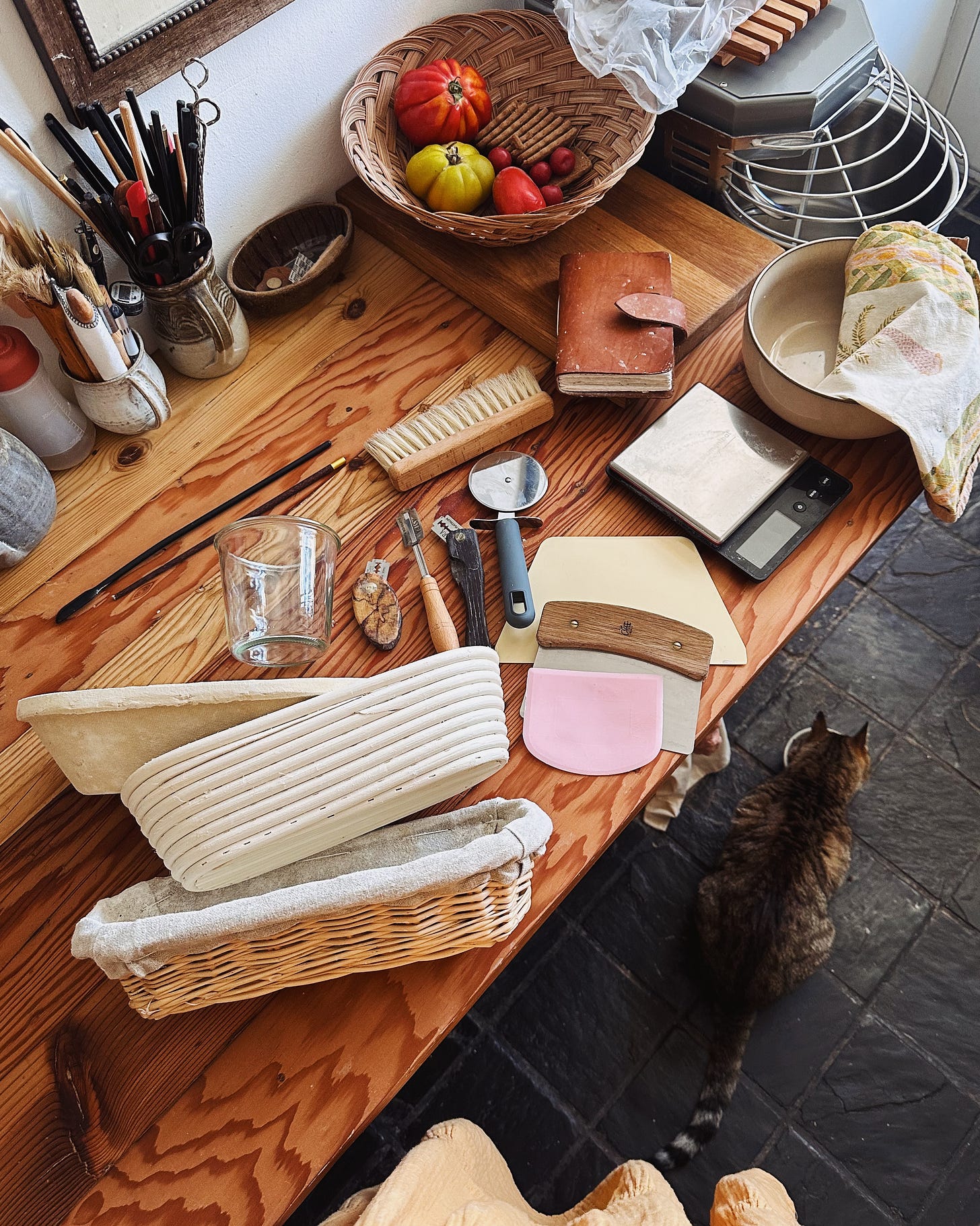 But let’s start at the beginning. When making a starter you really only need a jar, a spoon, flour and water. That’s it. You can even use a glass or a cup and cover it with cling film, so there is really no excuse to not start. While you make your starter you’ll have a week or two to look into tools to get and look around your house what you might already have.